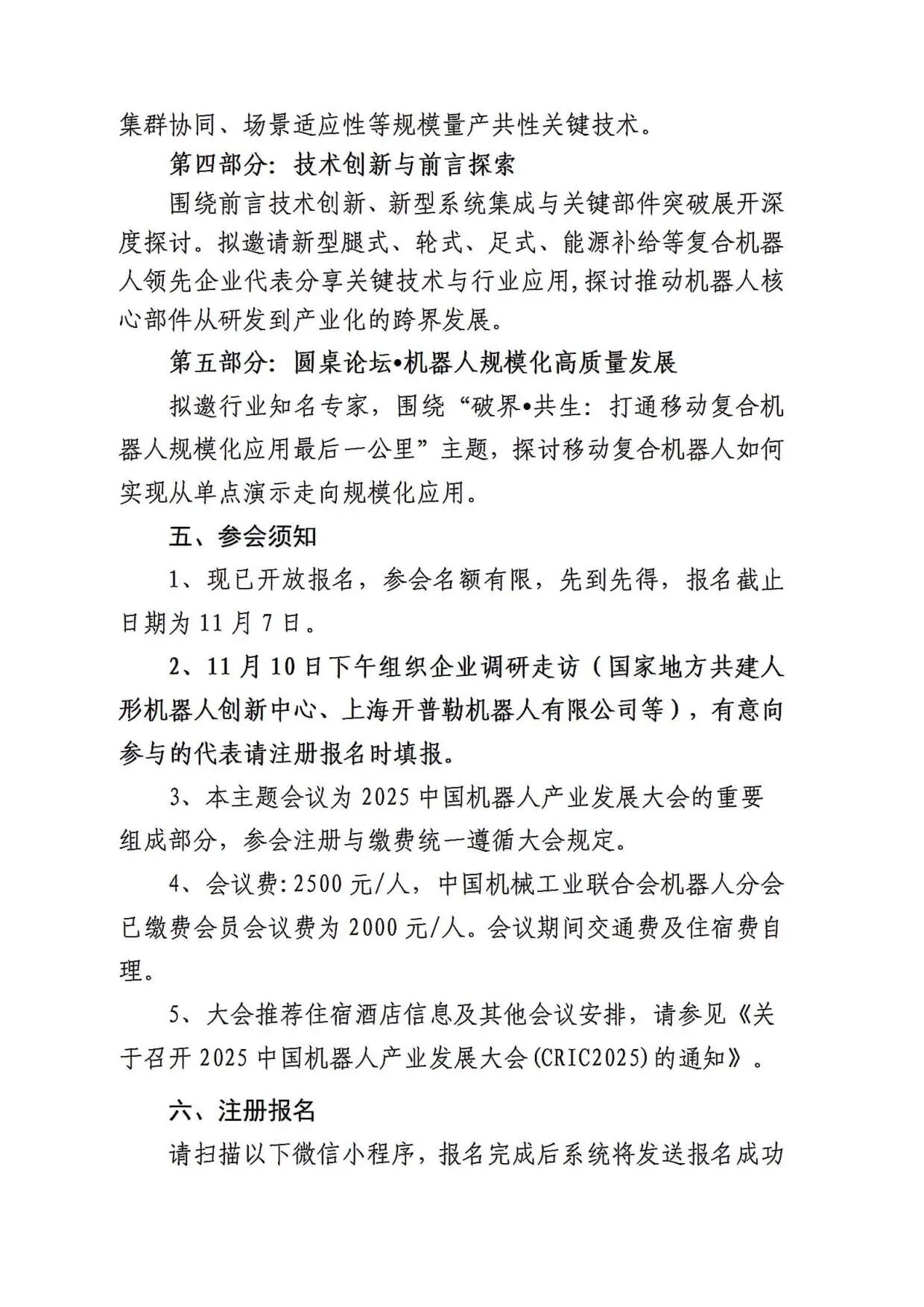 在2025中国机器人产业发展大会(11月10-12日)召开之际,特同期举办“2025移动复合机器人发展大会”。聚焦“破界•共生:打通移动复合机器人规模化应用最后一公里”论坛主题,探讨技术平台化、功能模块化、系统智能化、规模一致性、量产可靠性、易用性等行业共性难点问题,搭建一个高端对话平台。大会将邀请国内顶尖专家学者、领军企业代表、核心用户单位,共同探讨产业发展的机遇与挑战,展示最具代表性的落地应用案例,推动移动复合机器人技术在更广阔领域的规模化、智能化、安全化应用,共同绘制中国机器人产业新蓝图。
