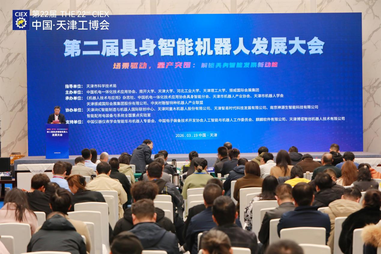 3月19日,第二届具身智能机器人发展大会在天津国家会展中心召开。本次大会由天津市科学技术局指导,中国机电一体化技术应用协会、南开大学、天津大学等单位联合主办,以“场景驱动,量产突围:解锁具身智能发展新动能”为主题。作为国内具身智能领域极具影响力的行业盛会,大会汇聚了50余位院士、行业顶尖专家及头部企业代表,共同探讨具身智能机器人技术创新、产业落地与标准建设等核心议题。机器人公司应邀参会。