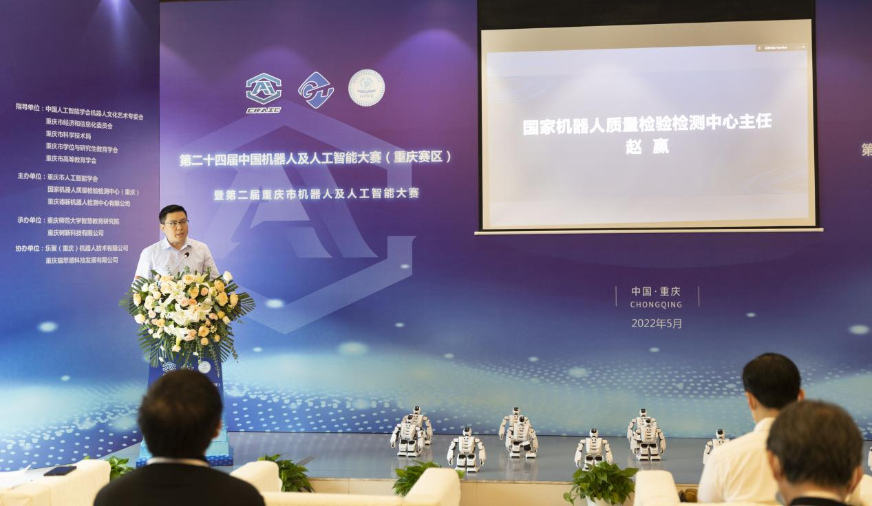 公司副总经理赵赢向各位领导与同仁的砥砺支持表示由衷的感谢,也对各参战队选手的到来表示热烈的欢迎。依托服务的工业基础以及广阔的市场空间和丰富的人才资源,重庆市已经成为全国机器人及人工智能产业发展最有活力的区域之一,凯瑞机器人作为中西部地区唯一的国家机器人质检中心,始终坚持围绕国家“十四五”战略规划,在机器人及高端智能设备、智能化系统的集成检测认证以及工业互联网方面持续加强技术投入,也有责任和义务为重庆市区域经济的高质量发展助力。