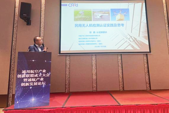 大会上,凯瑞机器人认证部部长彭鹏在“民用无人机:飞行创造无限可能”主题论坛中作《民用无人机检测认证实践及思考》专题报告,详细介绍了公司检测认证业务服务能力,并分享了民用无人机检测标准制定要求及未来发展趋势。