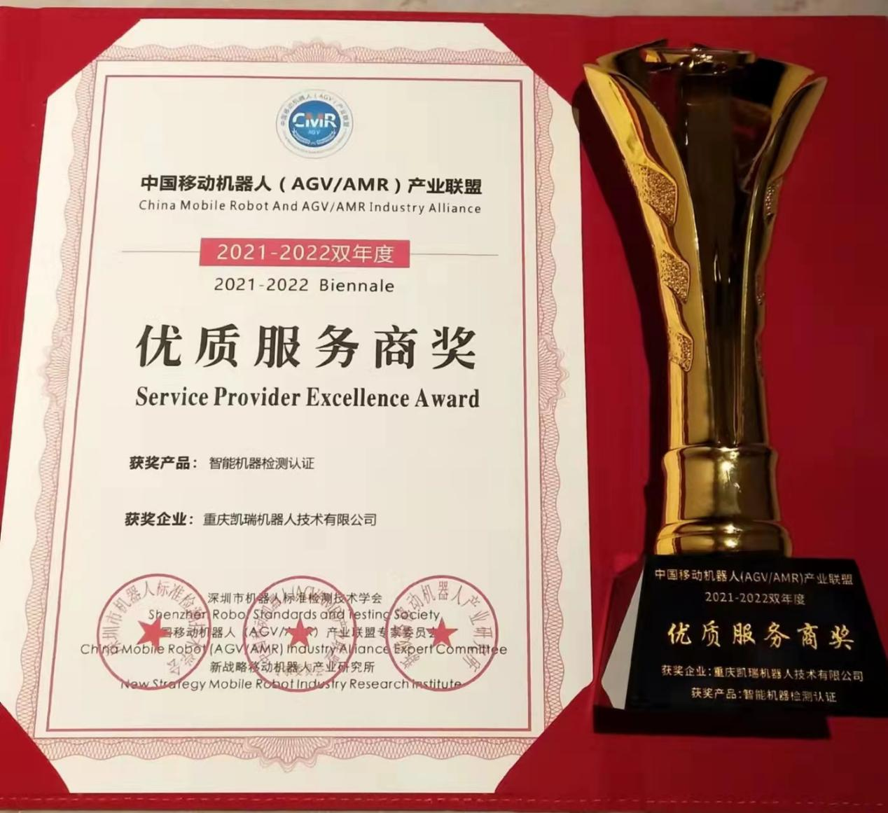 2022年,12月20日—22日,由CMR产业联盟主办的“2022移动机器人(AGV/AMR)产业发展年会暨移动机器人全行业系列甄选活动颁奖仪式”在杭州举行。历经初审、线上投票、专家及终端用户评审,最终重庆凯瑞机器人技术有限公司突出重围获评“优质服务商”奖。